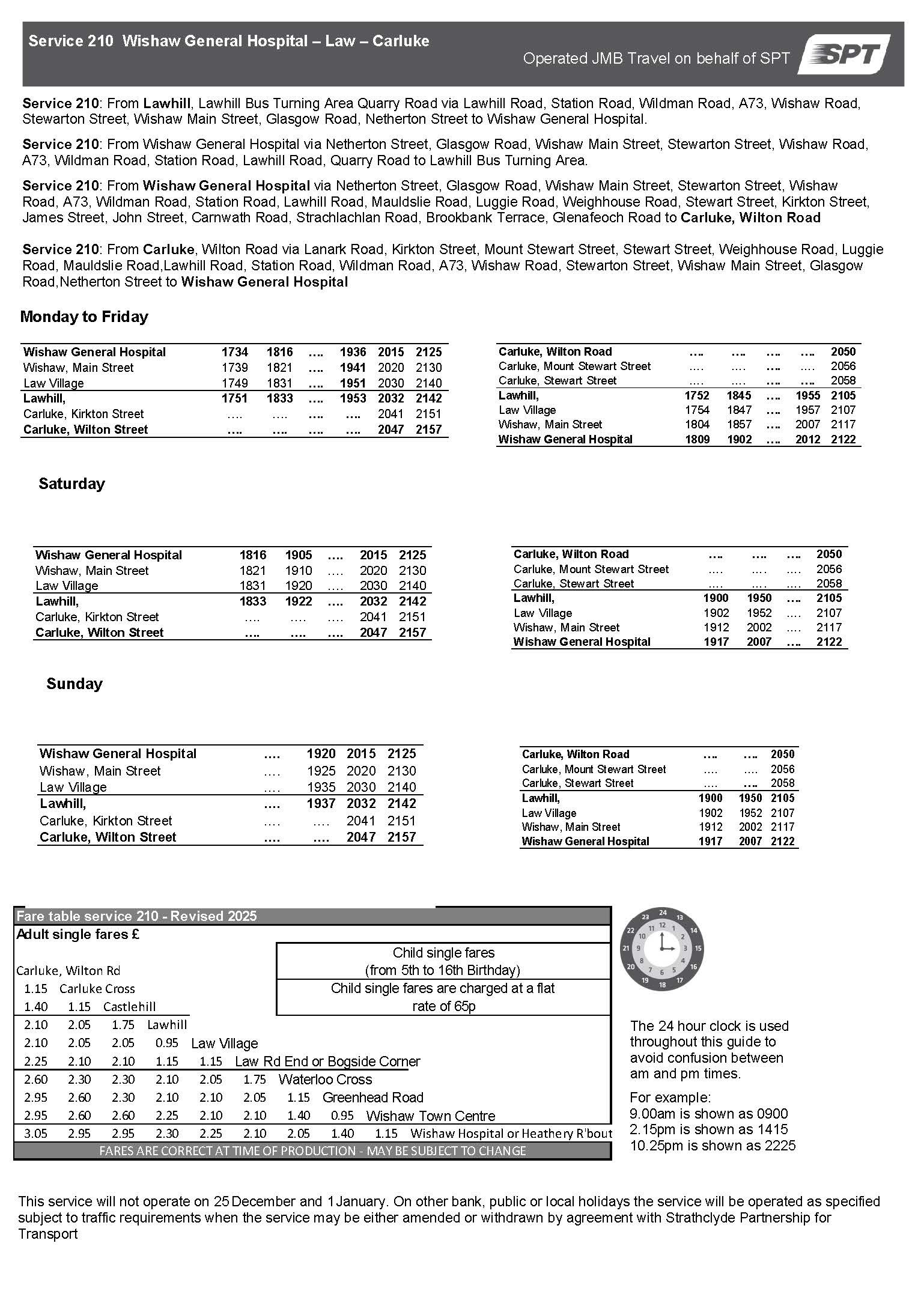 The 210 will operate to a revised timetable with early morning journeys and Sunday daytime journeys withdrawn. The late evening service is curtailed to finish earlier. The route in Carluke is slightly modified with buses operating a one-way loop using Carnwath Road to access Wilton Road.